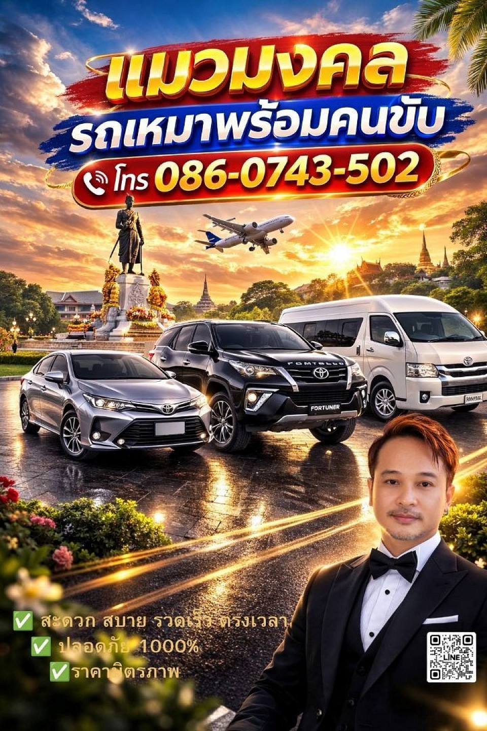 จะเดินทางต่างจังหวัด ไปท่องเที่ยวสถานที่ต่างๆ ไปสนามบินท่านจะไม่พลาดทุกการนัดหมาย ด้วยทีมงานพลขับที่มีประสบการณ์ตรวจสอบเช็คประวัติได้ทุกคน มีใจรักบริการ เชี่ยวชาญทุกเส้นทาง พร้อมให้คำแนะนำได้อย่างดี คนขับพักผ่อนเพียงพอ ไม่ดื่มเหล้าไม่สูบบุหรี่ ดูแลรถให้พร้อมเดินทางอยู่เสมอ รถใหม่ สะอาดทุกคัน